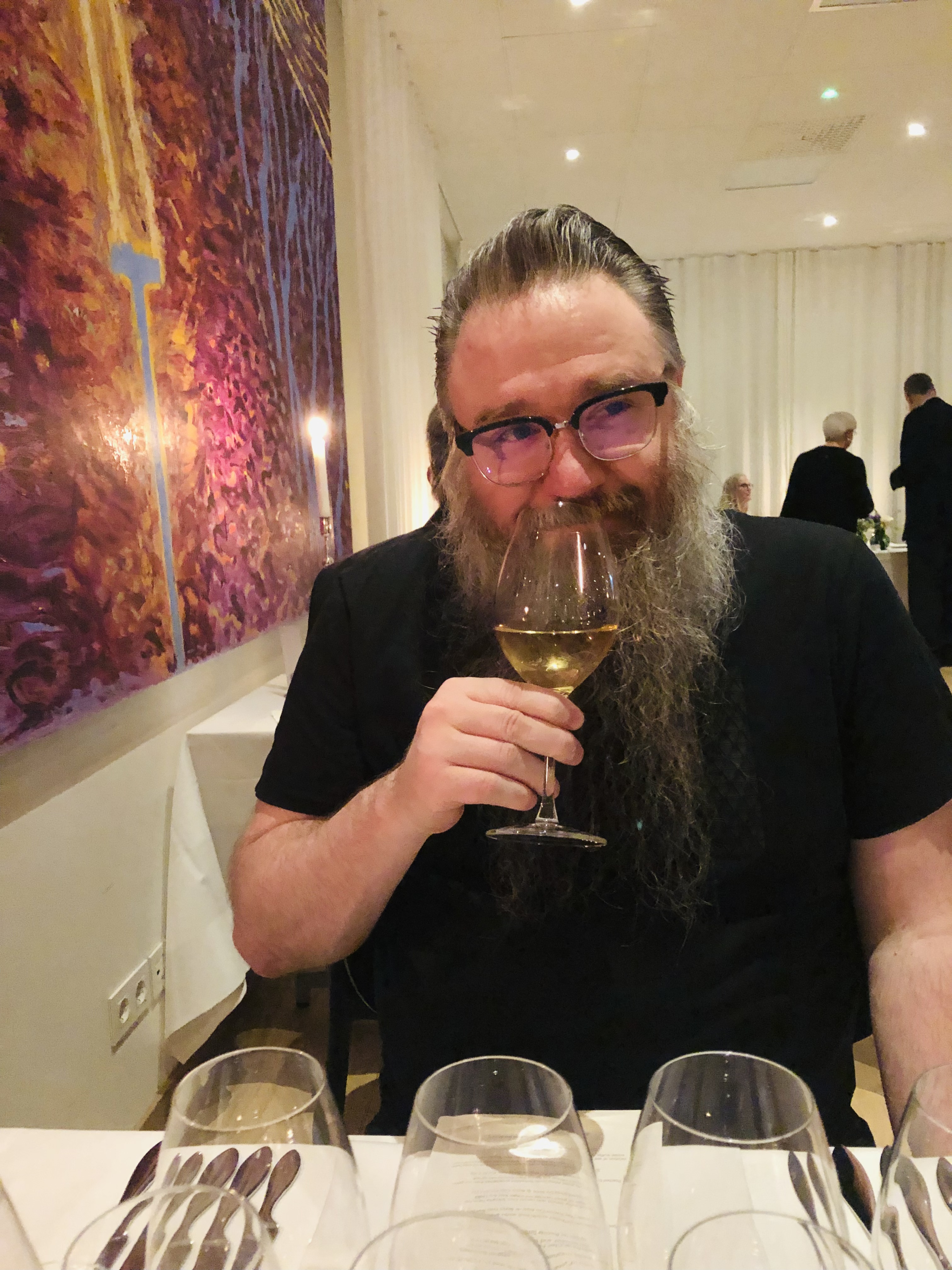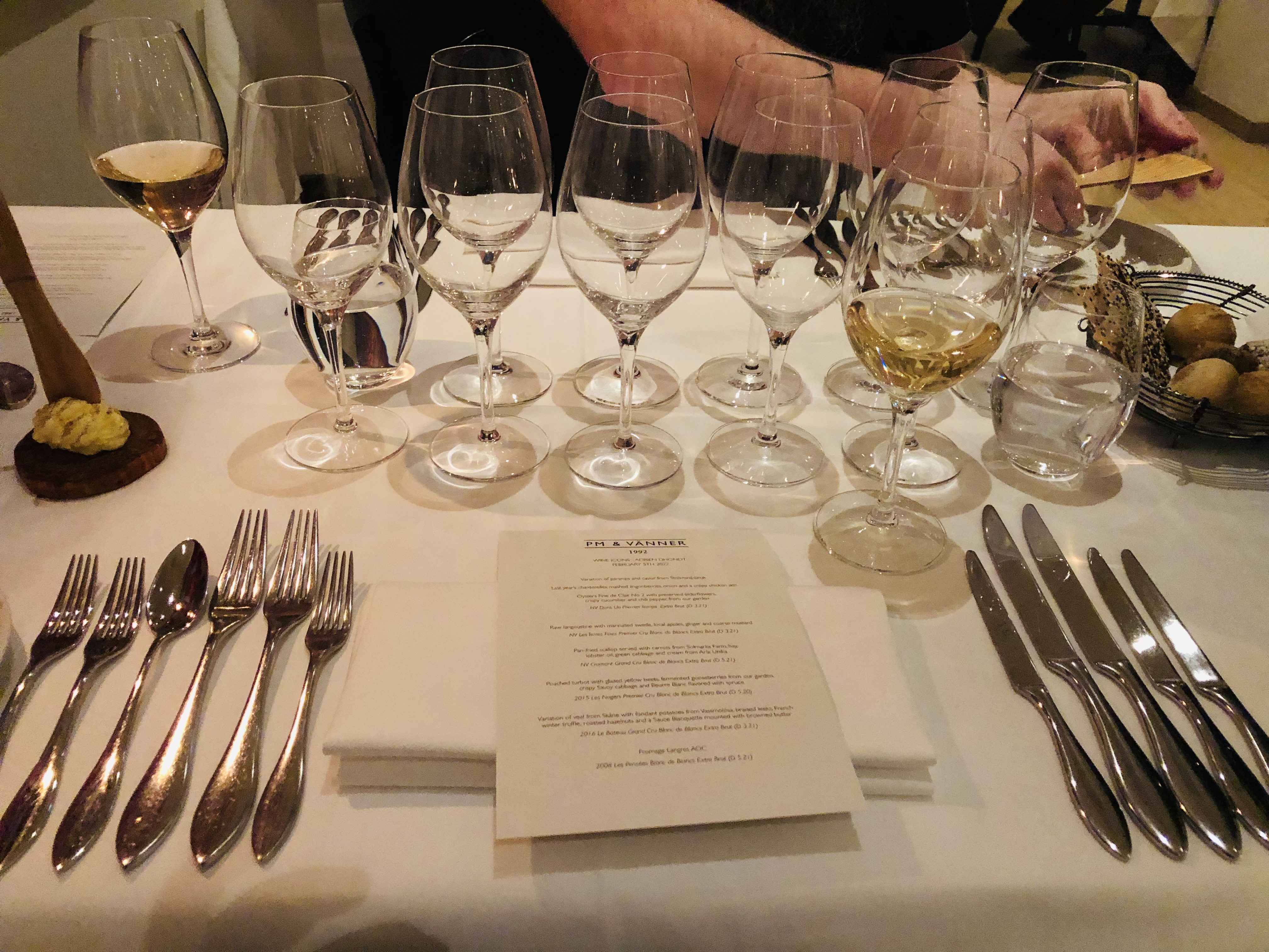 Och som vanligt hade vi en fantastisk kväll, personalen där är verkligen underbar. Trots att det man förtär oftast är fancy-schmancy så är de väldigt jordnära, som gäst så behöver man aldrig göra sig till eller försöka låtsas att man är finare än vad man är. När sommelieren hälsade oss välkommen vid dörren så frågade han “har ni druckit blö-blö-blööö förut?” och jag gissar att han syftade på nåt av kvällens viner. Verkligen inte, sa vi. Vi bara hörde att det skulle bli en massa skumpa och anmälde oss, vi har ingen koll på detta alls. Han bara skrattade och slussade oss vidare till nästa station. Och senare under kvällen så frågade jag om det finns nån som gör mousserande vin i Champagne-distriktet, som inte är champagne. Går det ens? Ja alltså rent tekniskt sett så går det, sa han. Fast det vore som att köpa en Ferrari och bara köra på tvåan. Tack, då förstår jag!